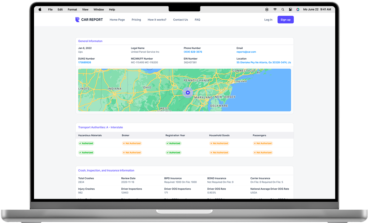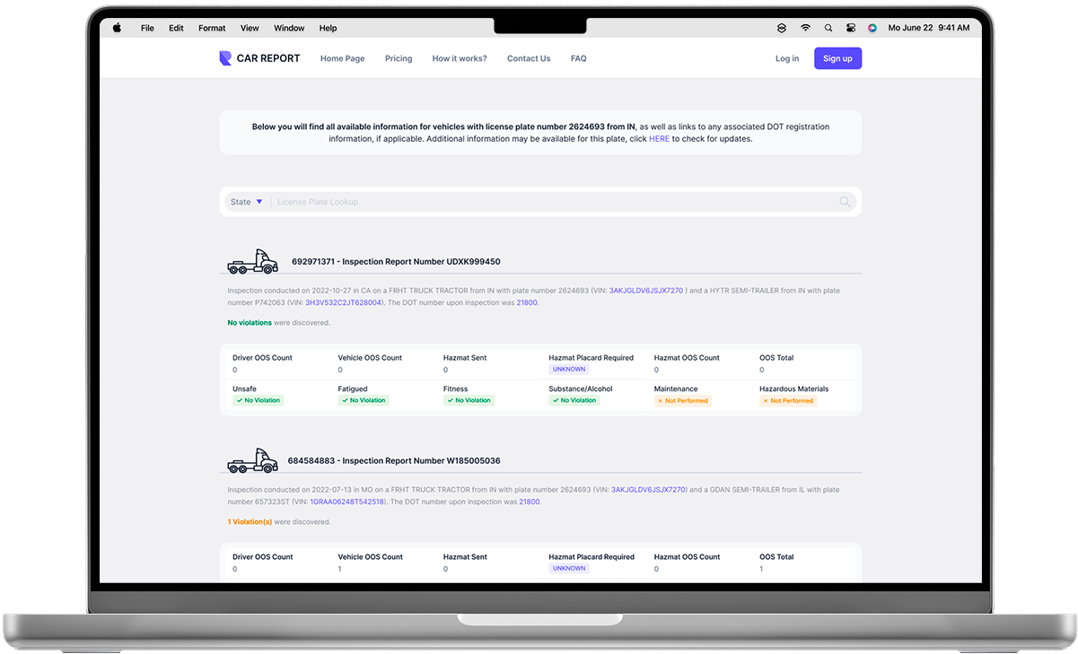 Get a full overview of a vehicle’s background, including crashes, inspections, insurance, and registration details. Everything is centralized in one clear report.
