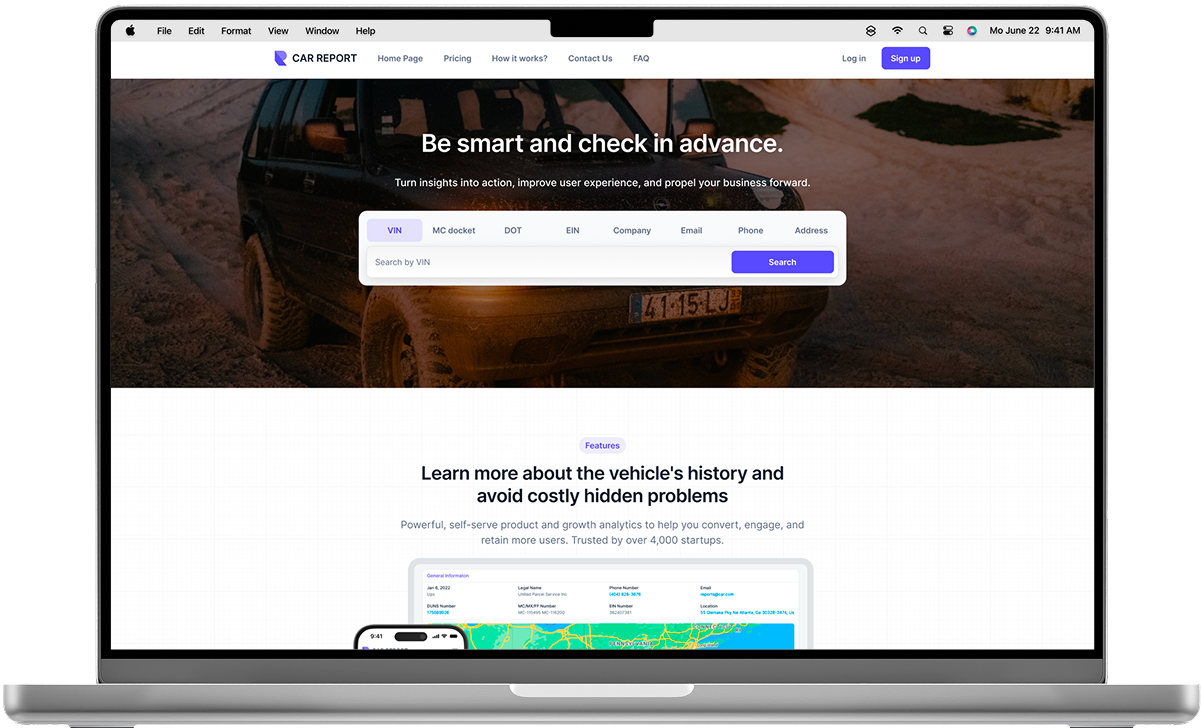 A digital platform that helps users check the real history of vehicles before purchase. The project was designed to minimize risks and provide full transparency through detailed reports, including crash records, inspections, registrations, and insurance data