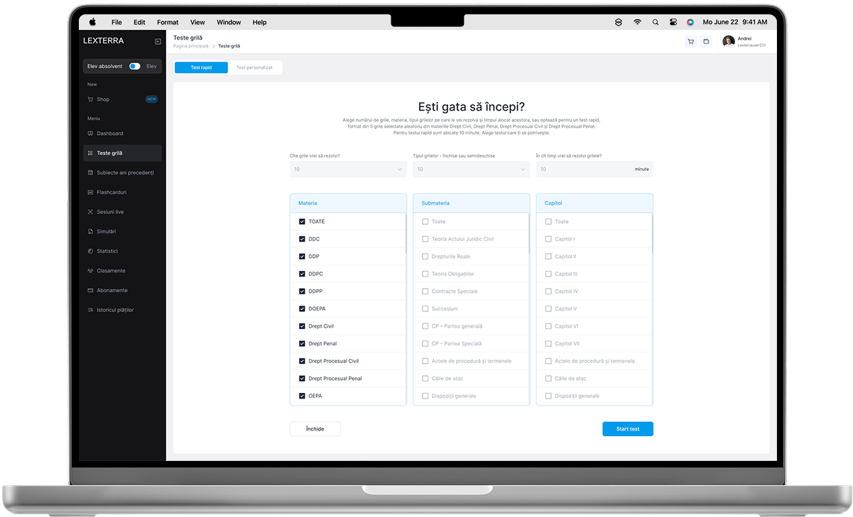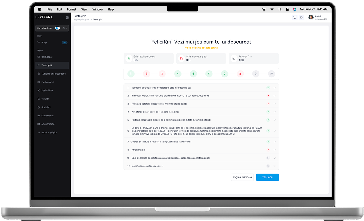 Lexterra.ro was developed as a legal training tool with thematic quizzes, statistics, and user competitions. We implemented advanced security measures, scoring systems, and interactive dashboards, plus secure payments for access to premium tests.